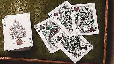 This Standard Edition features two monochromatic back-designs: Hunter Green and Deep Maroon. Twin Bucks are enshrined within beautiful flourishes that mimic the lush greenery found within Yosemite National Park. The ace of spades features a noble buck with herbaceous ornamentation crowning his dignified antlers, and each joker offers the antler name. The tuck-case features rich embossing and metallic accents all around.