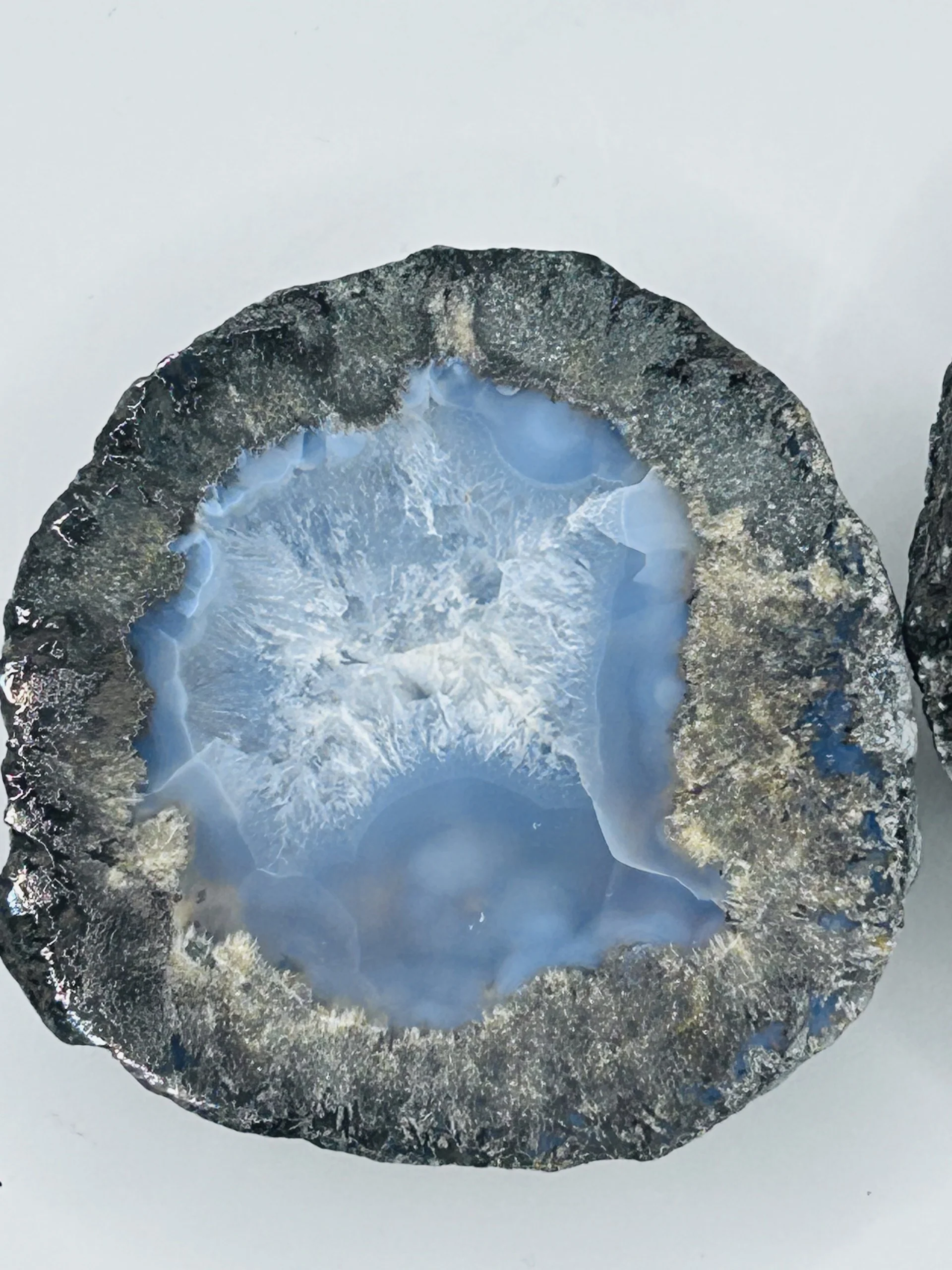This pair of coconut geodes from Mexico offers a stunning contrast between their earthy, nondescript exteriors and the sparkling quartz or calcite crystals hidden within. Split open to reveal their radiant cores, they symbolize transformation, protection, and the magic of inner clarity. Perfect for grounding rituals or display, these geodes remind us that beauty often lies just beneath the surface and in this paired offering, you get twice the enchantment.